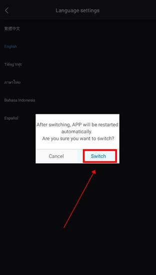 5、选择后,页面会弹出切换选项,点击右侧的【Switch】按钮。随后,App将自动重启,完成语言切换。